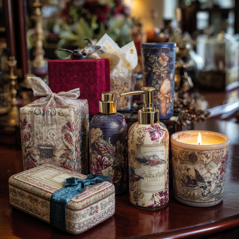 Our collections extend beyond soaps to include luxurious lotions, captivating candles, stylish kitchen textiles, and decorative paper goods. Each piece features our distinctive artistic designs that have become collectors’ items for many loyal customers.